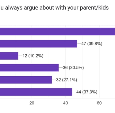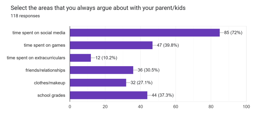 We are a group dedicated to bridging the gap between teenagers and parents. Our mission is to create a platform where both groups can anonymously share their thoughts and experiences. By allowing teens and parents to gain insight into each other’s perspectives, we aim to foster understanding, encourage adjustments in expectations and behaviors, and ultimately improve communication and relationships within families. The diagram below presents the results of our questionnaire, which highlights key areas of focus: Social Media and Games, Friendship, Clothes and Makeup, and Academic Grades. These categories will guide our efforts moving forward.